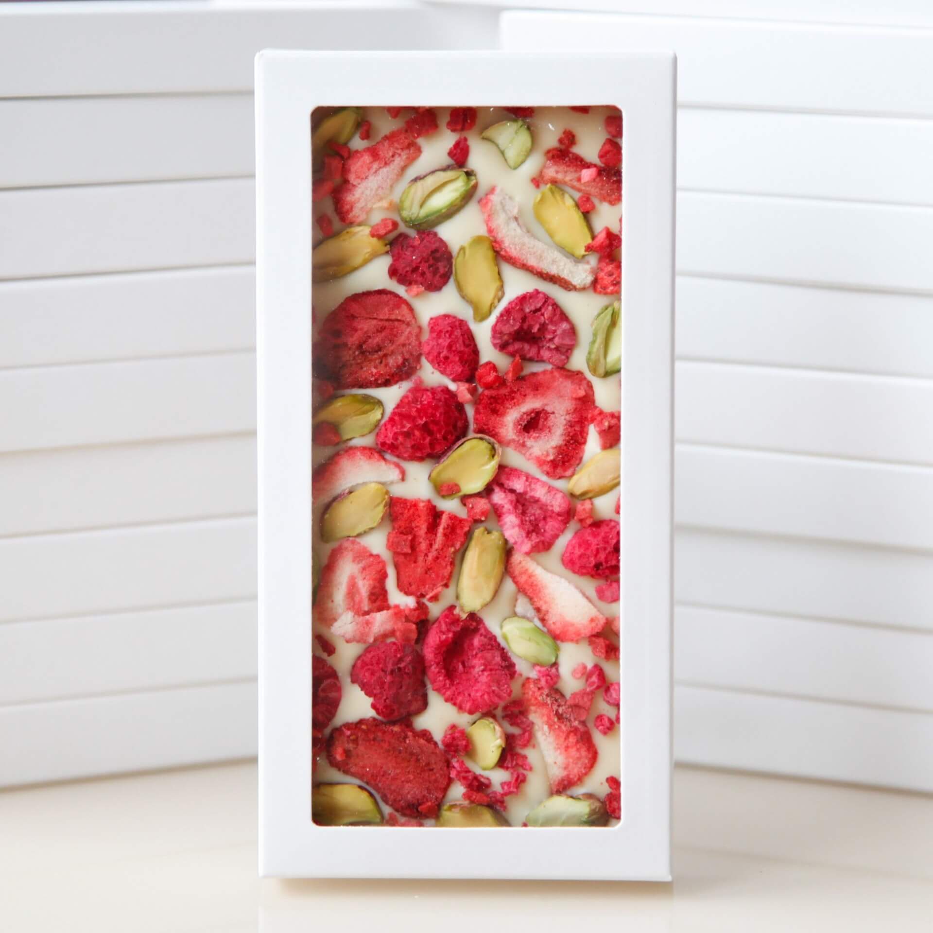 Главная -> Каталог -> Белый шоколад -> Белый шоколад с клубникой, малиной и фисташкой