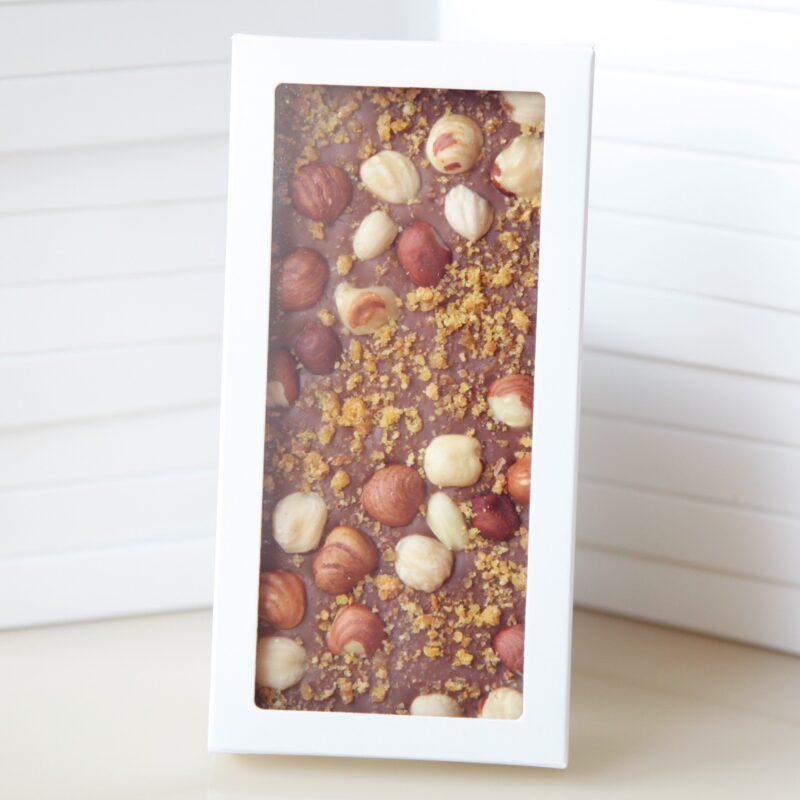 Главная -> Каталог -> Молочный шоколад -> Молочный шоколад ручной работы с фундуком и кусочками карамели