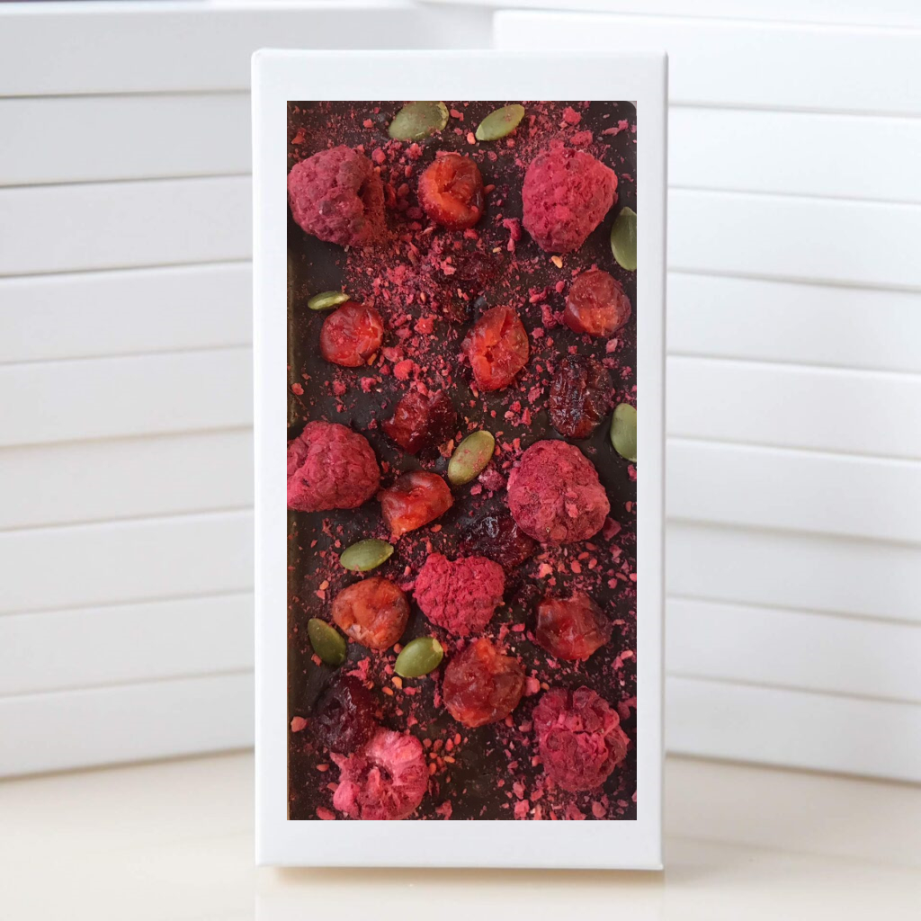 Главная -> Каталог -> Темный шоколад -> Темный шоколад с малиной, вишней, клюквой и тыквенными семечками
