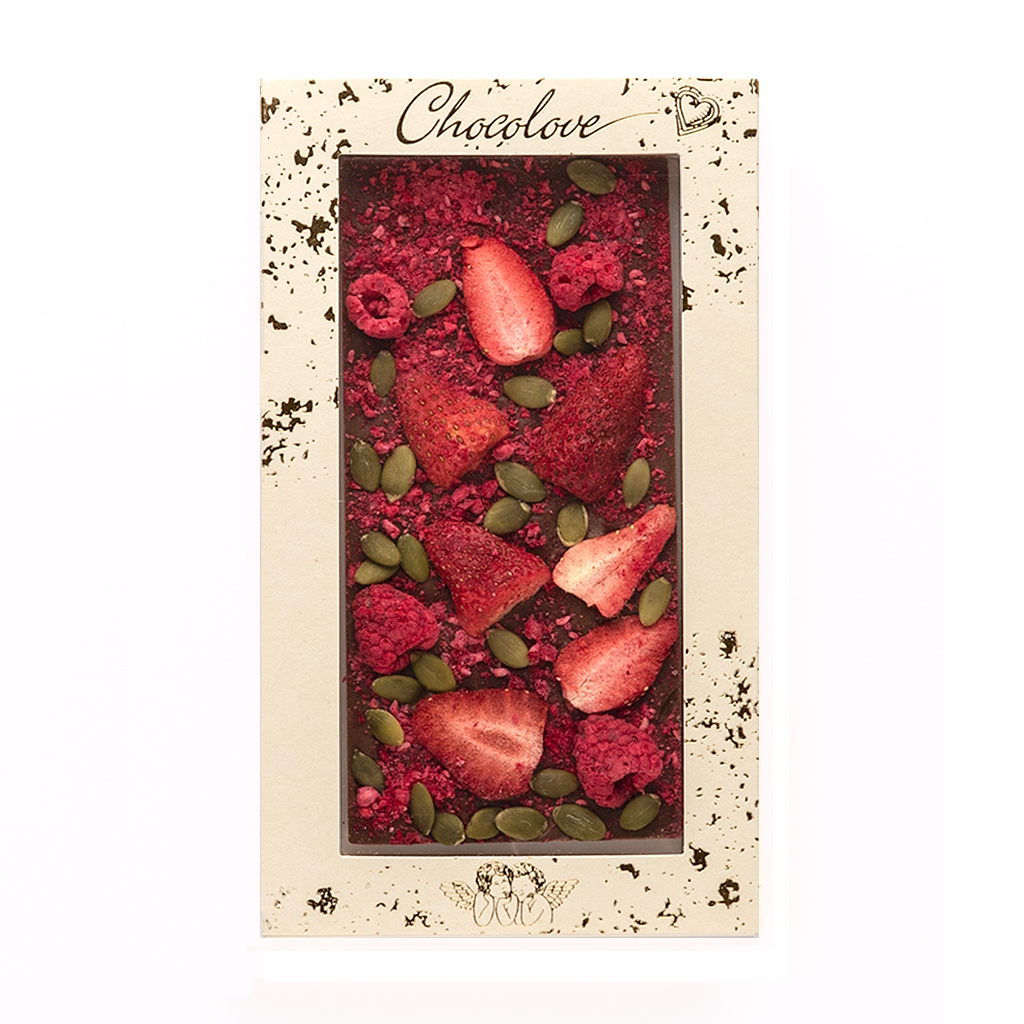Главная -> Каталог -> Темный шоколад -> Темный шоколад с клубникой, малиной и тыквенными семечками